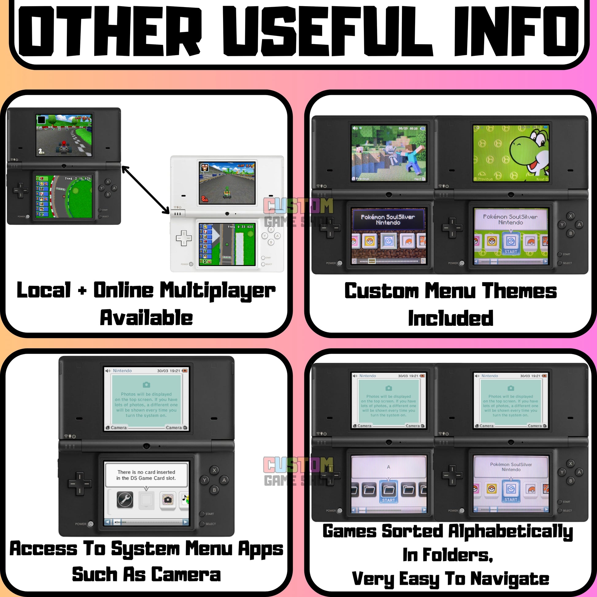 Online Store: The console connects to the Nintendo DSi Shop, where players can purchase and download games and applications.